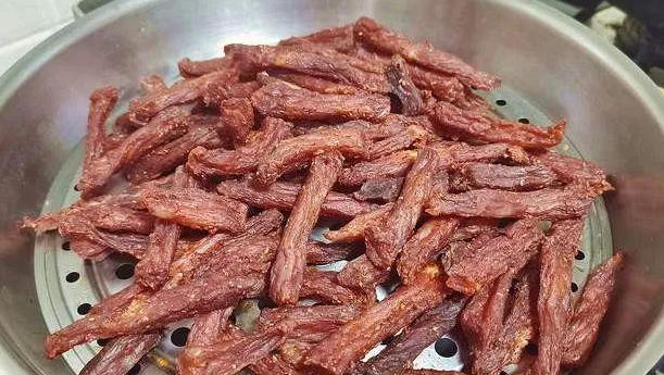把干的猪肉干放入蒸锅,蒸20分钟,取出后再铺开晾干表面水分就可以开吃啦!